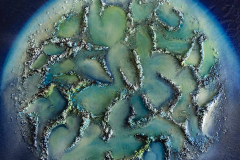 A luminous world, made of golden isles floating over a turquoise ocean. Below, the silhouette of a child points upward toward this suspended realm —a reminder that the world, our world, is sacred, fragile, and full of light. Created from Posidonia (Seaweed), one of the most vital marine plants for our planet’s oxygen, this piece is a quiet call to awareness, a celebration of life.
