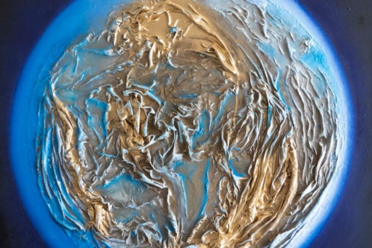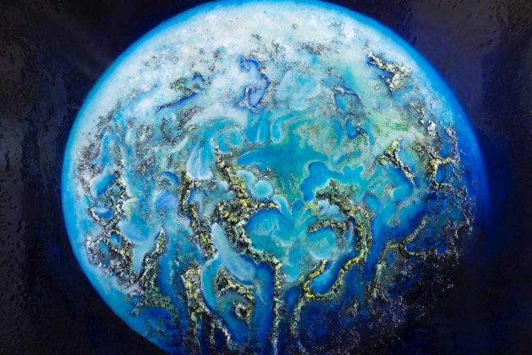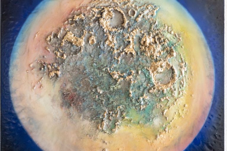 A volcanic world made of dirt and gold. The colors and the details it self that inspired the artist to create a world consumed by greed and power. The finish of this art piece gives the impression that the world is covered in water.